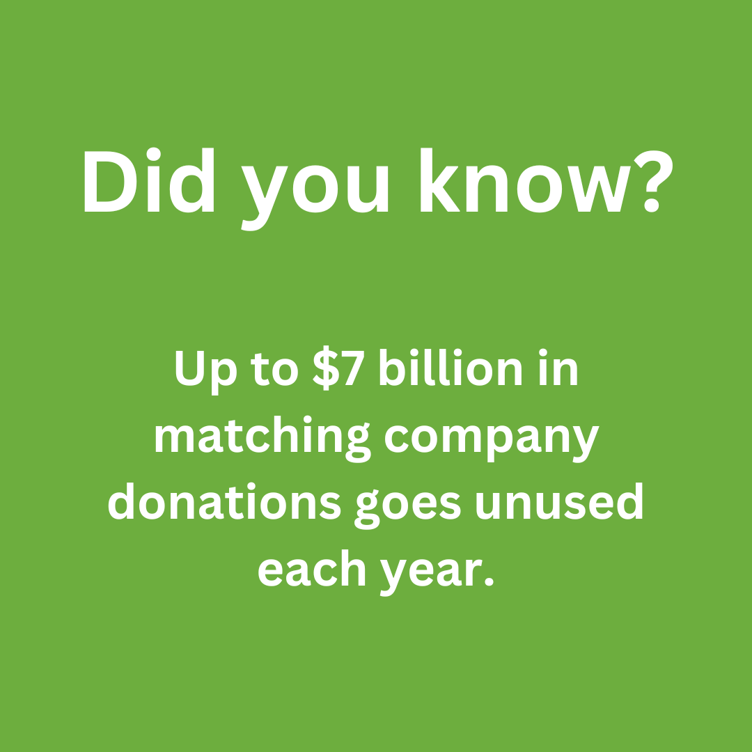 Also, many companies support their employees’ charitable giving by matching their donations. And yet, a 2021 story on CBS News says that as much as $7 billion goes unused each year (https://www.cbsnews.com/news/charitable-billions-of-dollars-go-unused-every-year/)