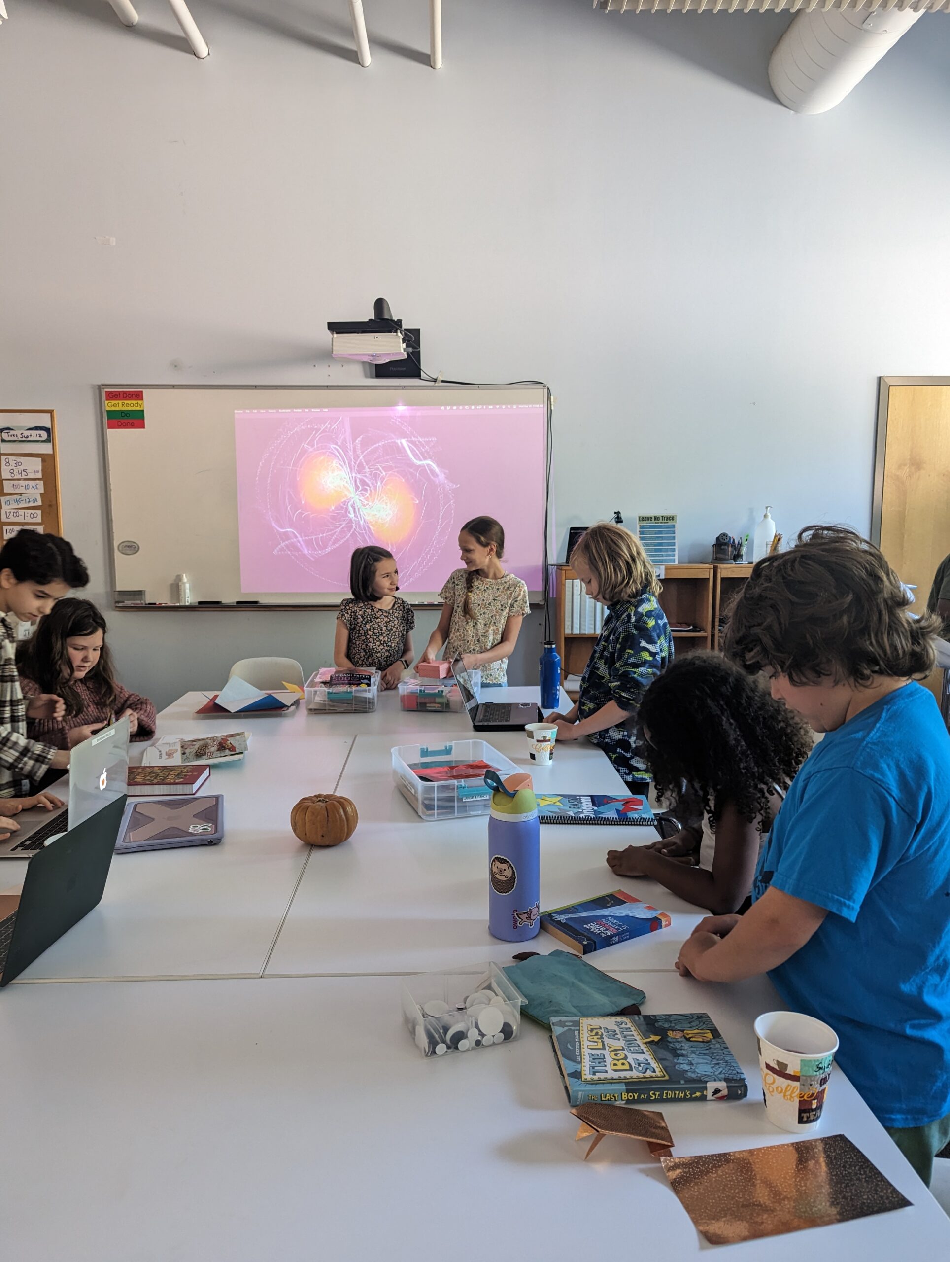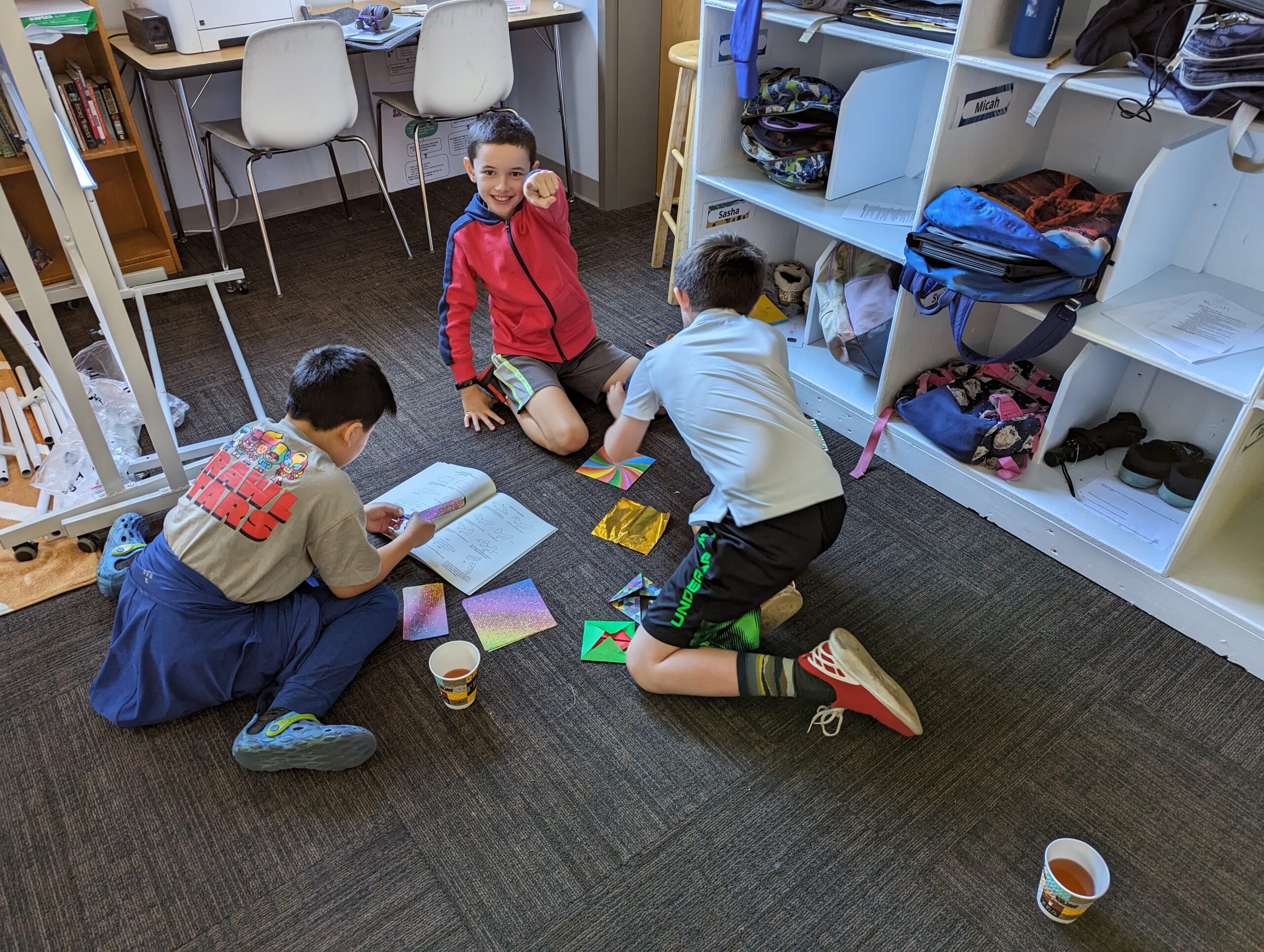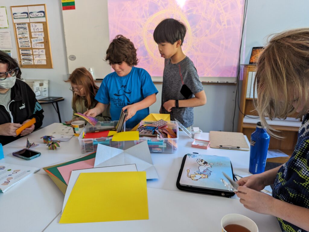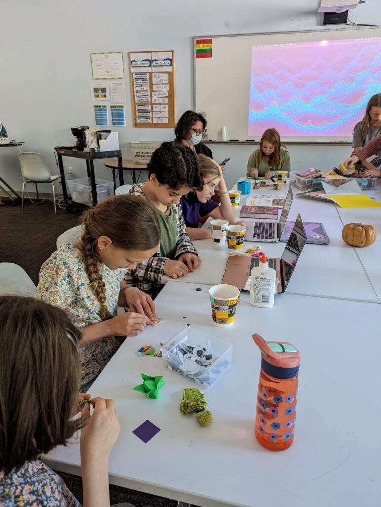 Chill Origami Café is open to both upper and lower school students, and we meet every Wednesday morning. Before class starts, I brew a big pot of herbal tea and select some calming music and visuals to project. We’re very lucky to be based in Ms. Renee’s room, which she’s decorated with the most lovely and comfy furniture and lots of plants — the café vibe is definitely there! We keep the lights low, and our group norm is that we refrain from talking, or speak softly in our “library voices”. We have a huge array of different sizes and kinds of origami paper, from very basic solid colors to fancy holographic designs, shiny metallic paper, and hand-made traditional paper from Japan. Students quietly sip tea and explore creating designs on their own or in small groups, aided by an assortment of instructional books and YouTube videos on iPads. Everyone works at their own pace on items that they choose to make, taking home their creations when they’re done.