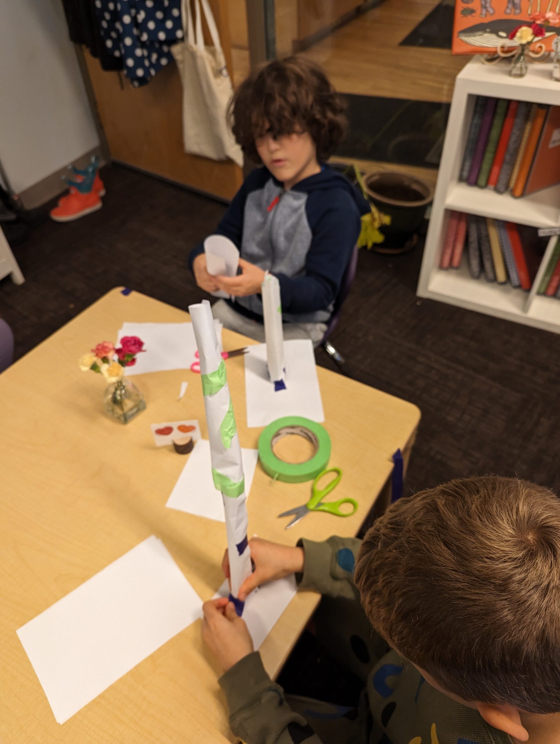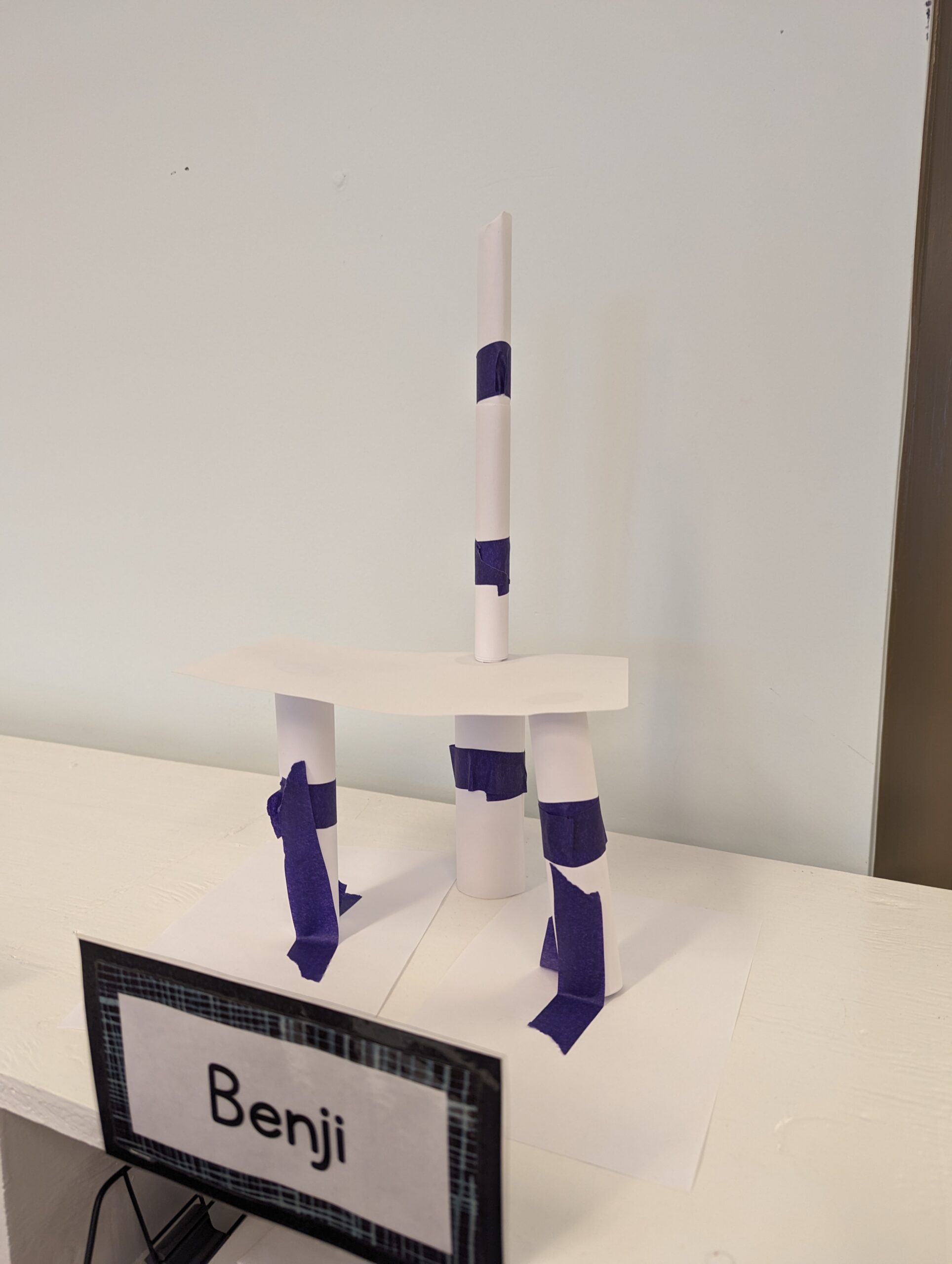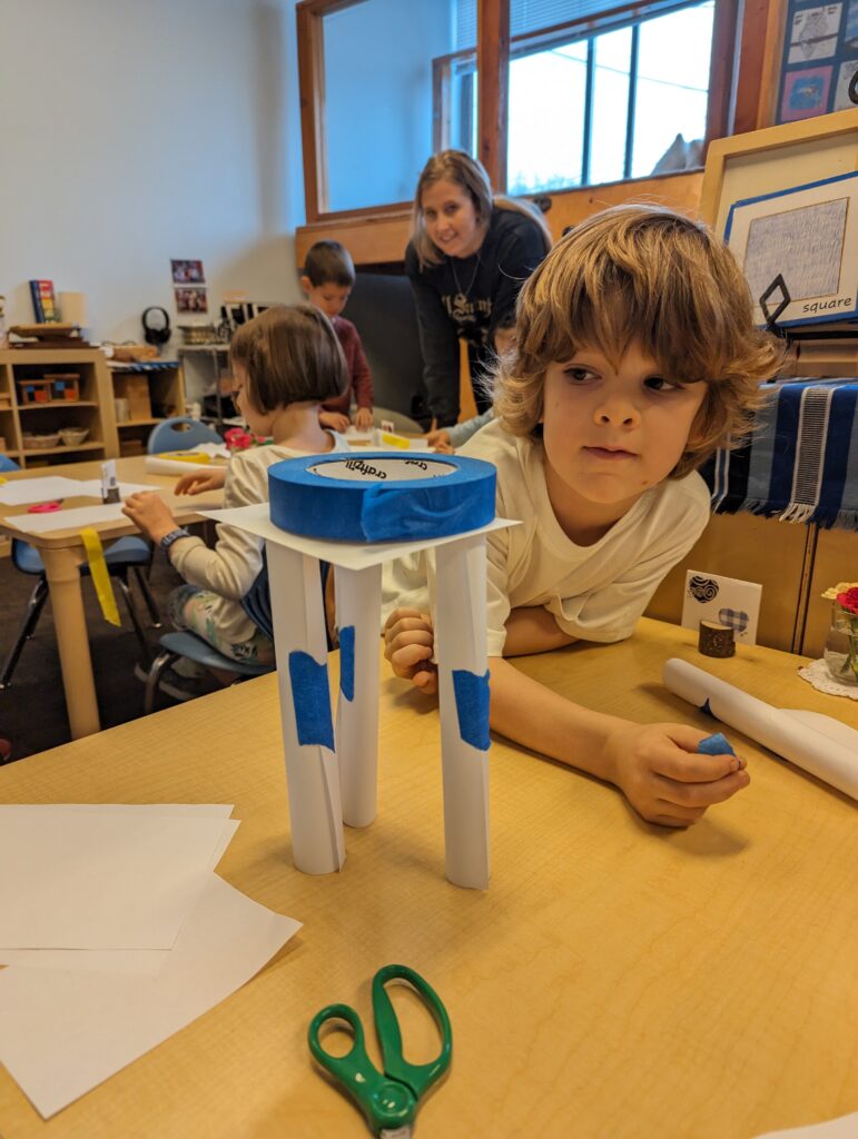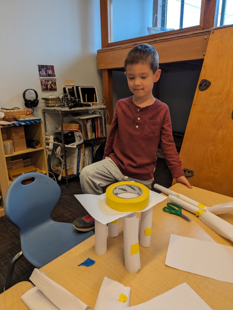 In these first few days, I’ve been focusing on the basics of engineering and building, using paper as the primary material. It’s always exciting to help students discover just how strong paper can be when it is in the right shape. We discussed and experimented with various kinds of paper columns and basic shapes — circles, squares, triangles, cones, and “accordion folds”. After learning some foundational building techniques, I let the students loose on two different design challenges. The first challenge was to build towers for height and stability, the second challenge was to build for sturdiness. I think the second challenge was the class favorite, as students got really excited to place classroom objects ranging from tissue boxes and pairs of scissors to wooden blocks and books on top of their towers to test for strength.