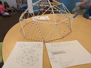 Returning with Ms. Kathy, we explored the geometric beauty of geodesic domes and learned a little about the legacy of engineer Buckminster Fuller, who popularized them in the mid 20th century. After building domes with Ms. Kathy, we continued with the natural geometry theme and created paper spheres out of many smaller circles and triangles. That paper folding led to another project – making paper kites! Quality engineering projects always allow room for students to get creative and make their own designs, and also challenge students to deliver some kind of functionality that is obvious and testable to students and adults alike. For the kites, we started with a basic design and then made changes and additions through iterative testing to develop even better designs. The students had a great time testing their kites over and over again with our industrial shop fan we brought into the classroom so that we could have a steady, reliable wind.